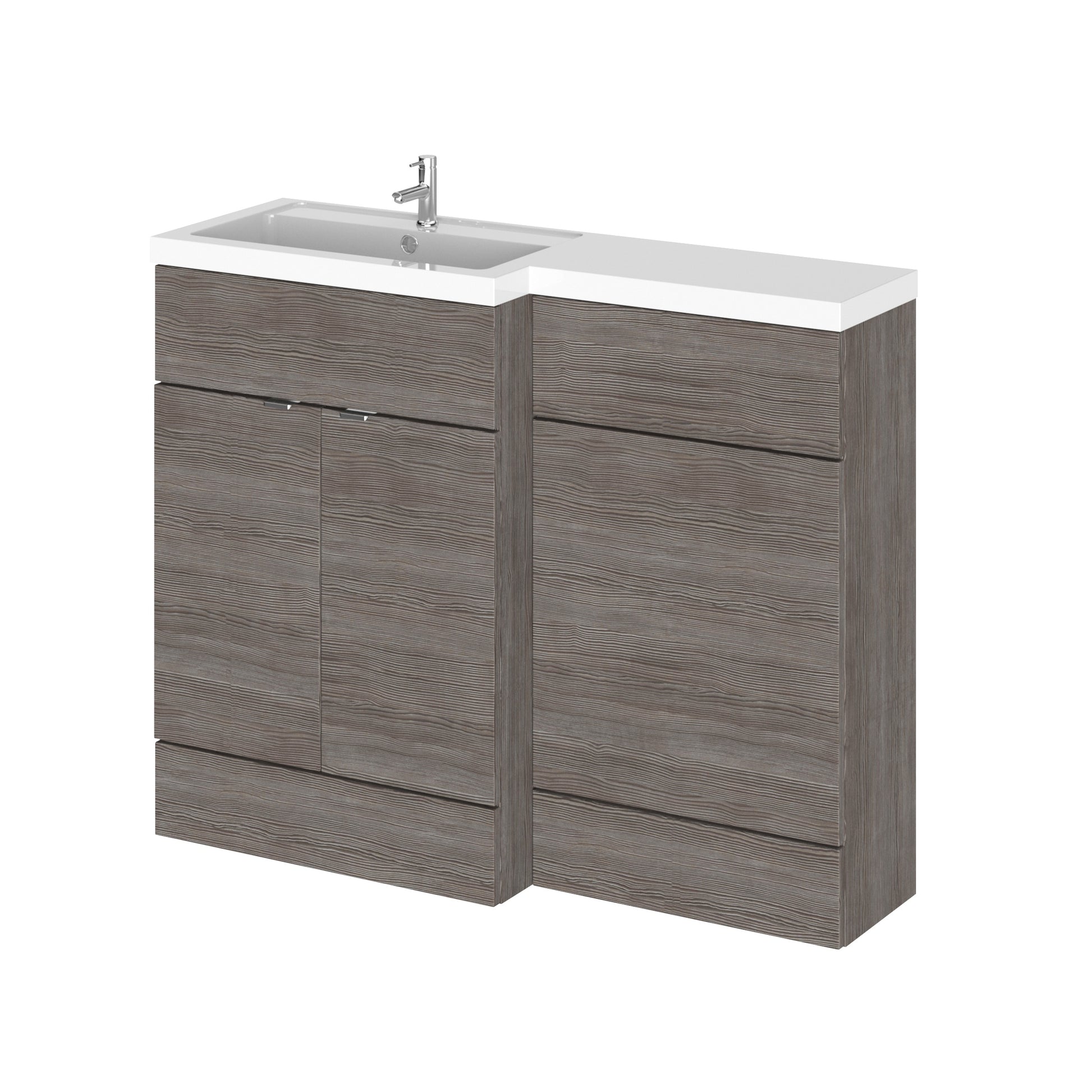 The Stonewater 1100mm Grey Woodgrain Left Hand Pack combines style and practicality for modern bathrooms. It includes a 600mm vanity unit, a 500mm WC unit, and an 1100mm L-shaped basin with a matching worktop, providing ample storage while maintaining a compact design suitable for various spaces. The contemporary Grey Avola woodgrain finish and gloss white worktop enhance its aesthetic appeal. Designed for left-handed orientation, the pack features polished chrome handles and a flush button for added convenience. Pre-assembled for easy installation, it fits seamlessly into most layouts without sacrificing storage or style. With a 5-year guarantee, this set offers durability and affordability, making it a smart choice for quality bathroom furniture.
