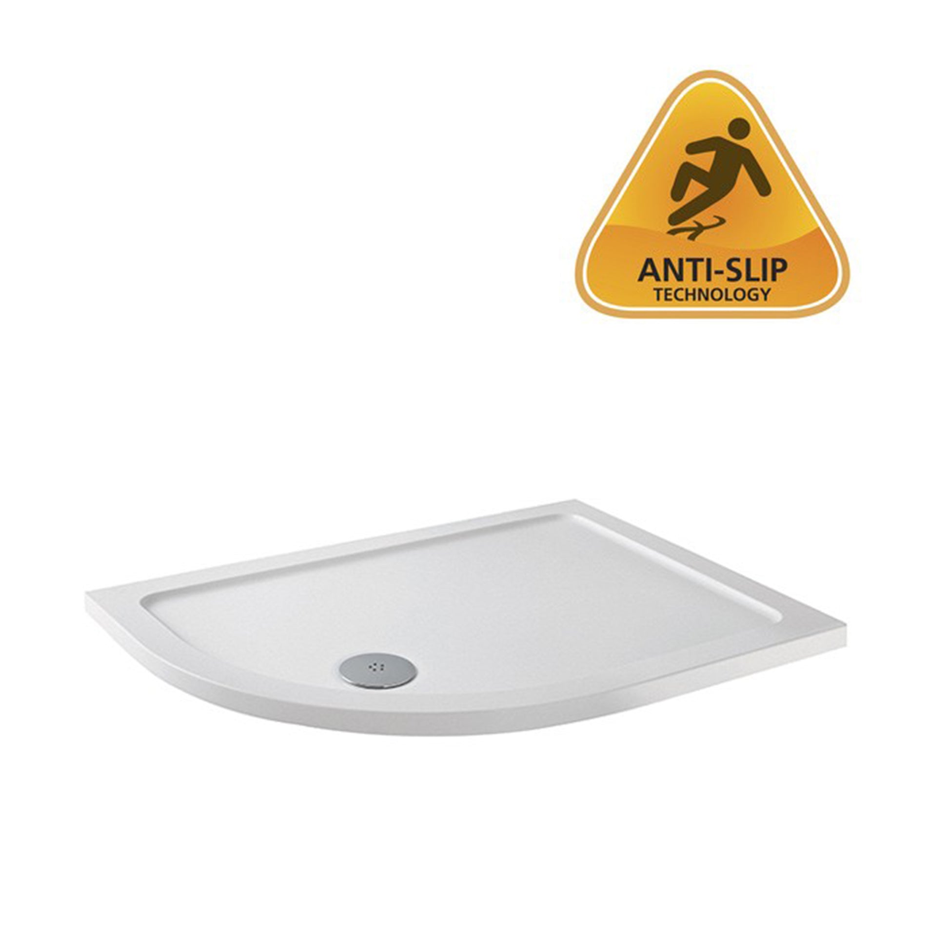 Safety is prioritized with an anti-slip surface, ensuring secure footing in wet conditions. At just 40mm in height, the low-profile design allows for easy entry and exit. The waste is conveniently positioned along the curved edge, supporting a 90mm waste size for effective drainage.