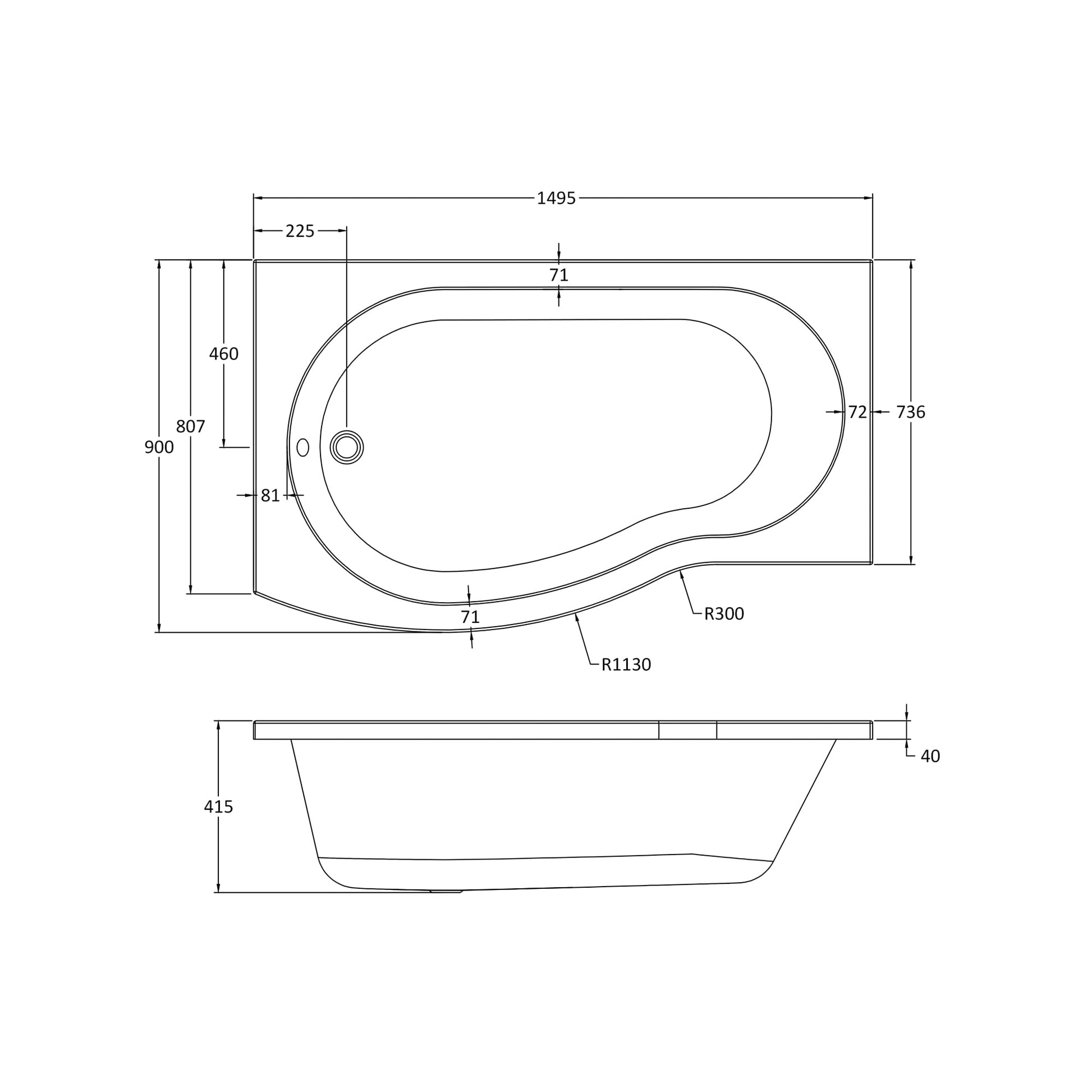 Its left-handed orientation and ergonomic B-shaped design provide a comfortable bathing experience while optimizing space. The bath measures 1500mm in length and 900mm in width, offering a generous 200L capacity for a relaxing soak.