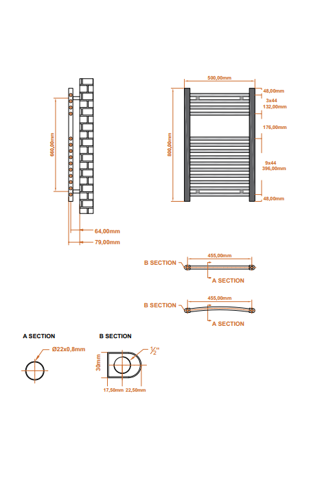Measuring 800mm high and 500mm wide, with a depth of 30mm and a maximum projection of 90mm, it offers flexible pipe center configurations of 75-90mm, making it suitable for different installations. The 22mm bar diameter optimizes heating efficiency.