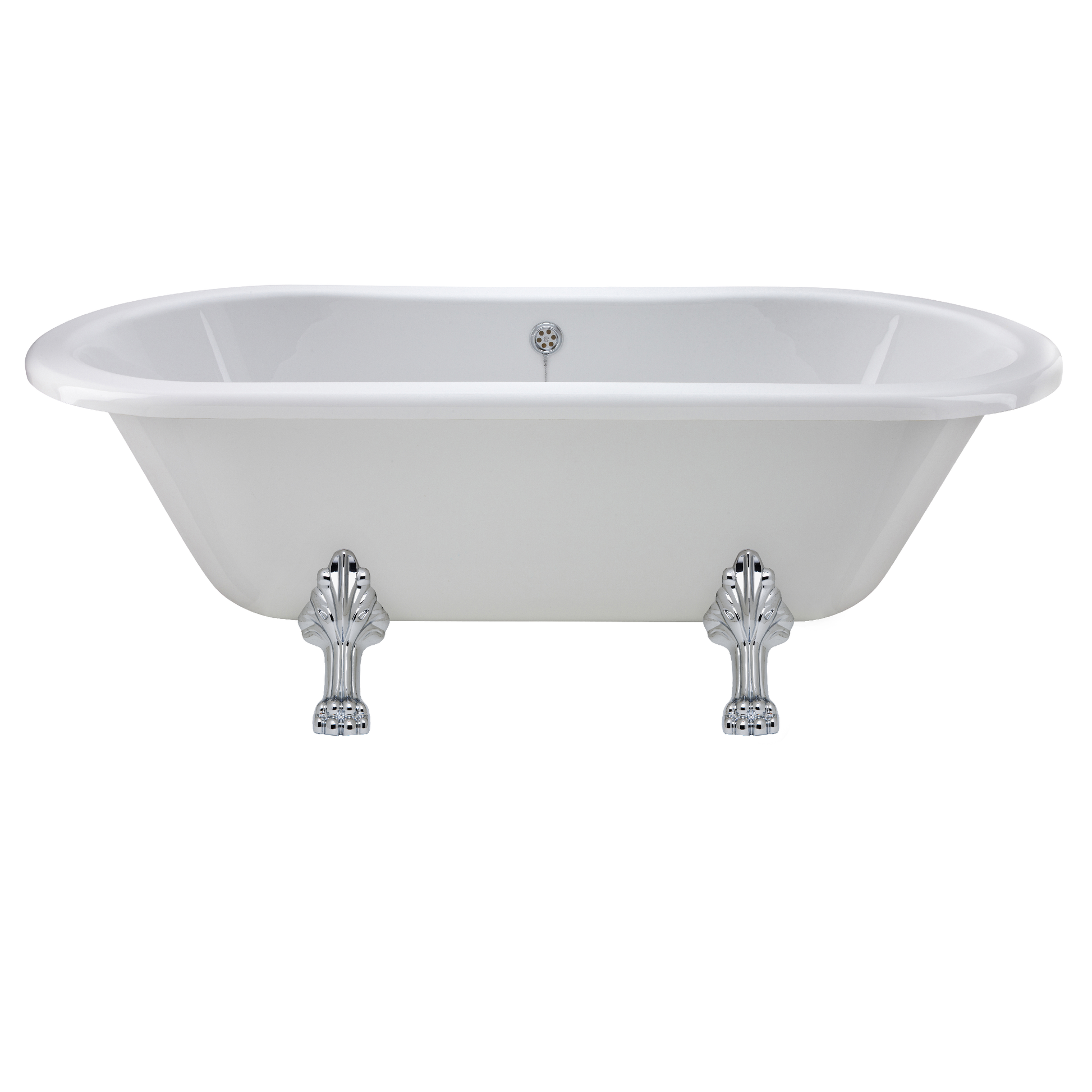 Its classic white finish and chrome Pride Feet provide a sophisticated touch that complements both traditional and modern designs. This bath features a tap-hole-free design, allowing for versatile installation options, and includes an overflow for added convenience.