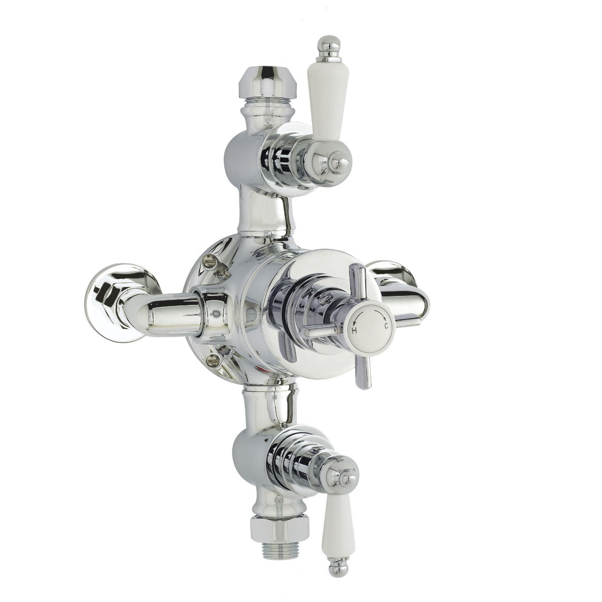 The Fairford Bolsover Exposed Thermostatic Triple Shower Valve enhances both the aesthetic and functionality of your bathroom. This British-manufactured valve features a classic crosshead and lever design, crafted from solid brass with a chrome finish for durability. With two outlets, it efficiently operates both an overhead and hand shower, compatible with various plumbing systems, including combi-boilers and gravity-fed setups.