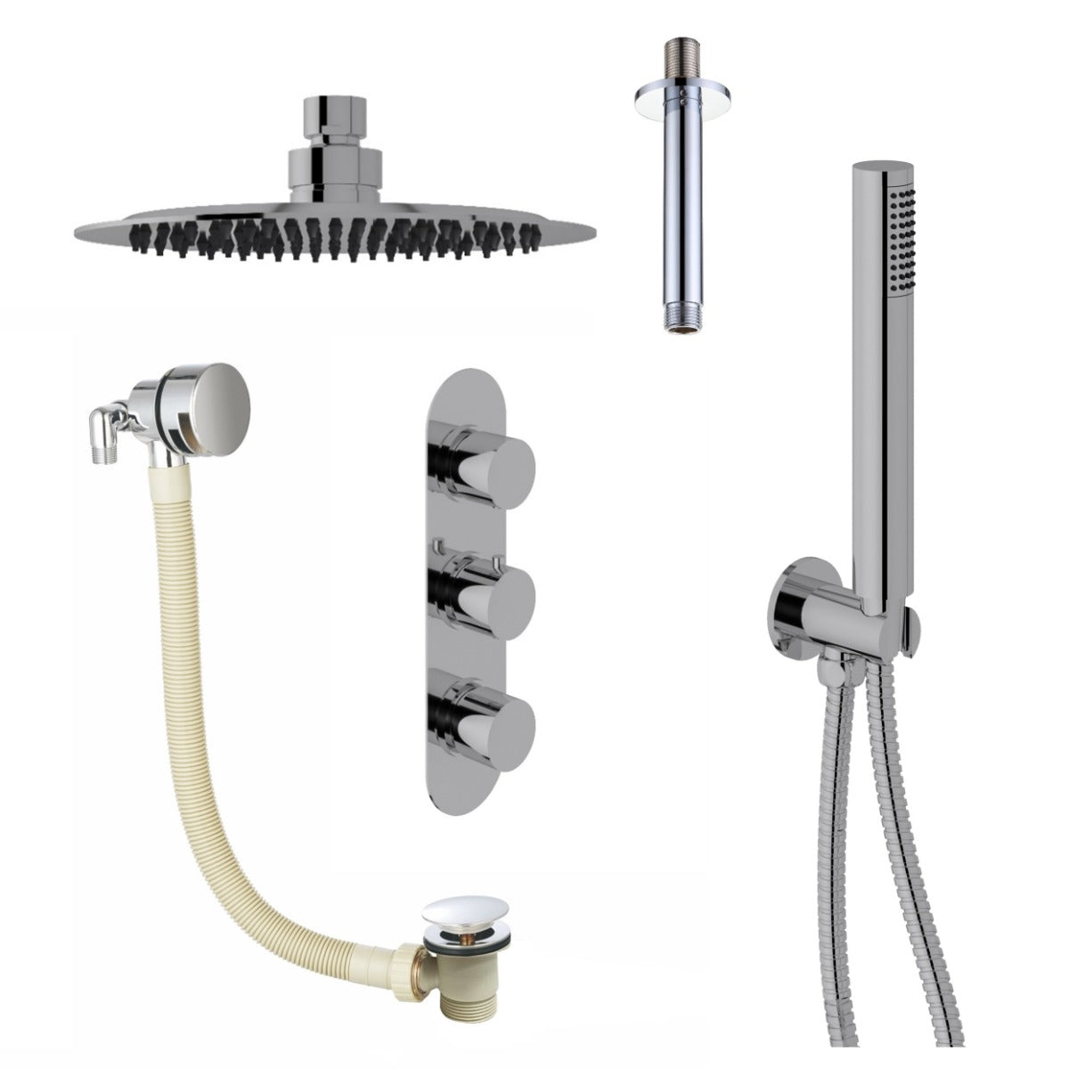 - Contains: Single outlet concealed valve, microphone handset, hose, outlet bracket, 200mm shower head, ceiling mounted arm, bath overflow filler