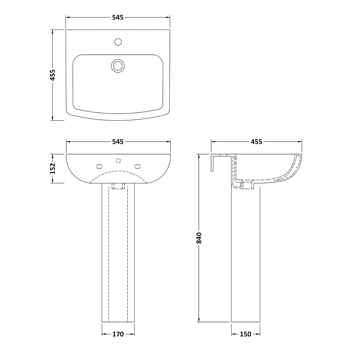 With a spacious bowl measuring 545mm wide and 455mm deep, it ensures comfortable daily use, while the full pedestal design neatly hides plumbing. Standing at 840mm tall, it offers ergonomic convenience and includes an integrated overflow to prevent spills.