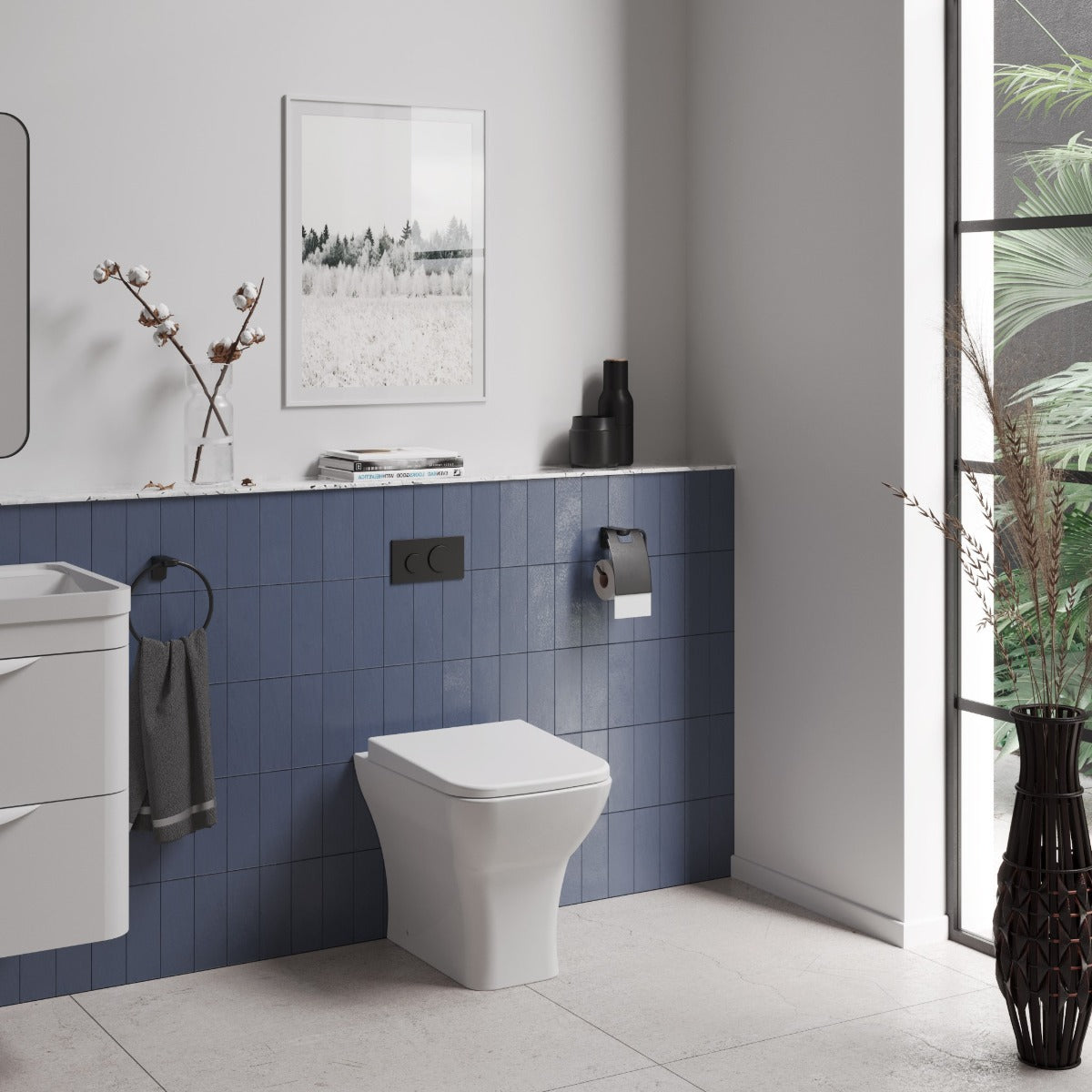 - Back-to-wall configuration concealing pipework and cistern