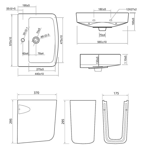 The semi pedestal design enhances its sleek profile and simplifies installation by concealing plumbing. Its dimensions include a pedestal height of 175mm and width of 295mm, along with a single tap hole for convenient mixing tap installation. An integrated overflow adds to its practical use, preventing spills.