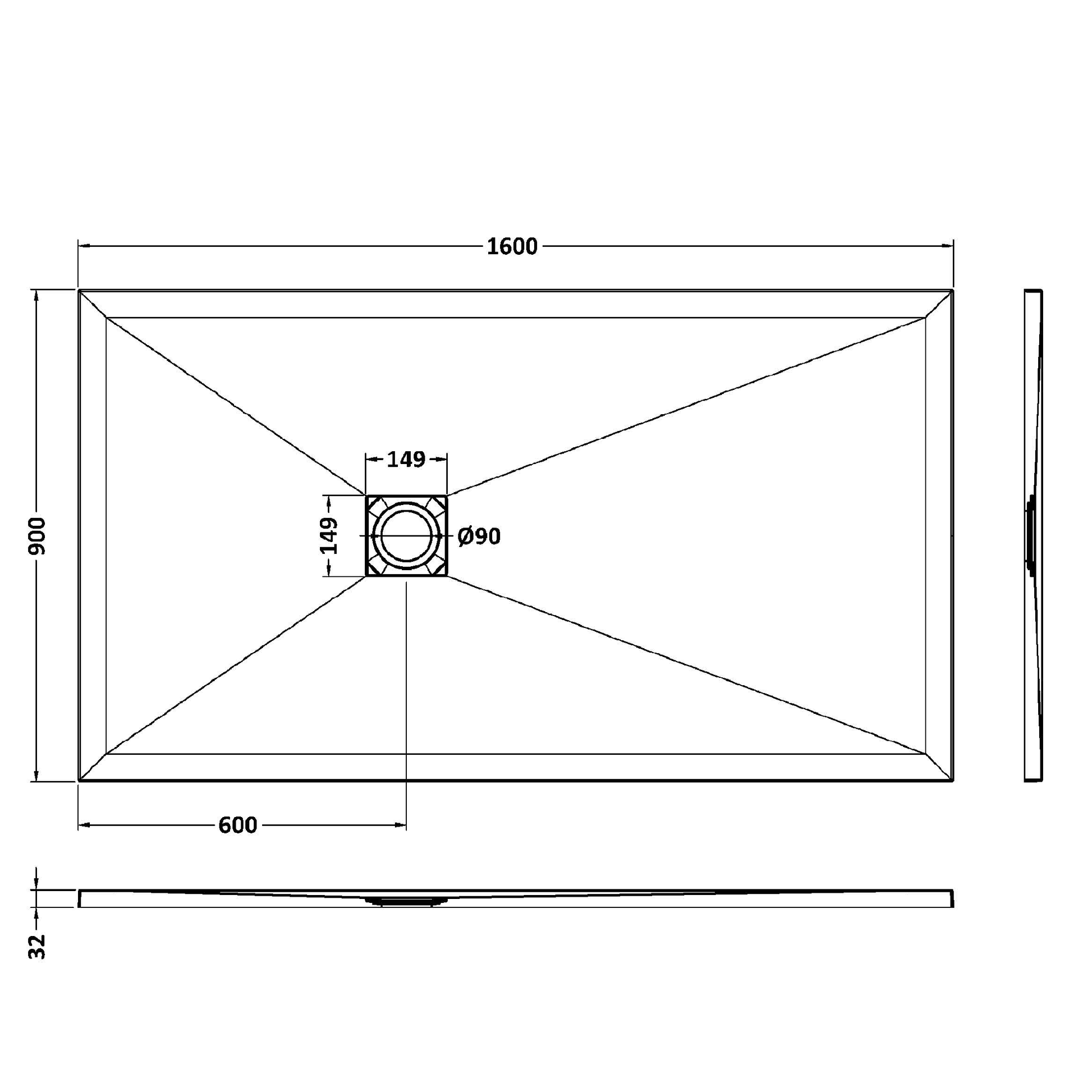 Measuring 1600mm by 800mm, the rectangular shape provides ample space for comfortable showering, while its slim 33mm height ensures easy access. The centrally positioned 90mm waste facilitates effective drainage, and though a waste is not included, compatible options are available.
