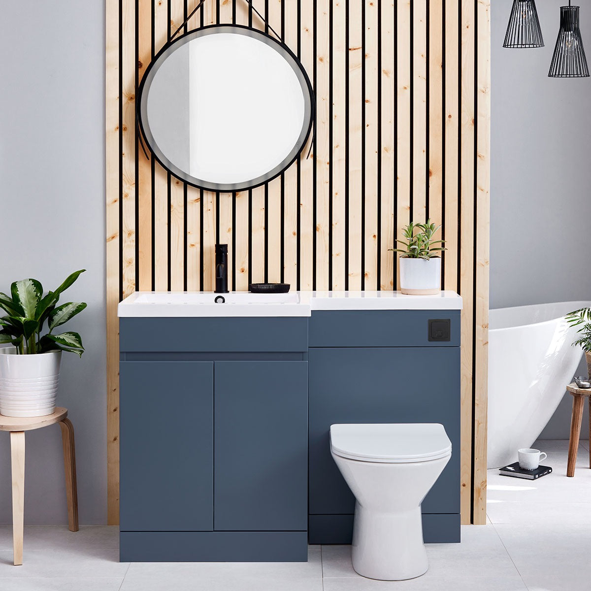 The Fairford Resonance 1100mm Blue Left Hand Combination Pack is designed for modern bathrooms, combining practicality and style in a sleek rectangular unit. Finished in blue vinyl-wrapped MDF, it offers both durability and aesthetic charm. The set includes a spacious 1100mm polymarble basin with a glossy white finish and an L-shaped design that maximizes space while providing a generous depth and width. The basin comes equipped with an overflow and a single tap hole for easy installation.