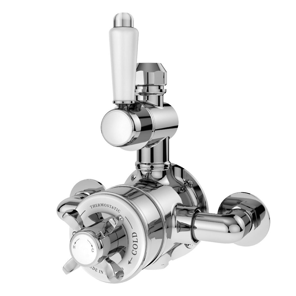 The Fairford Tamber Exposed Thermostatic Shower Valve with Diverter provides a customizable showering experience with support for two outlets, allowing for both rain showers and handheld rinses. Crafted in Britain from high-quality brass and durable ABS, this valve features a traditional design with crosshead and lever handles, complemented by a chrome finish that enhances its visual appeal.