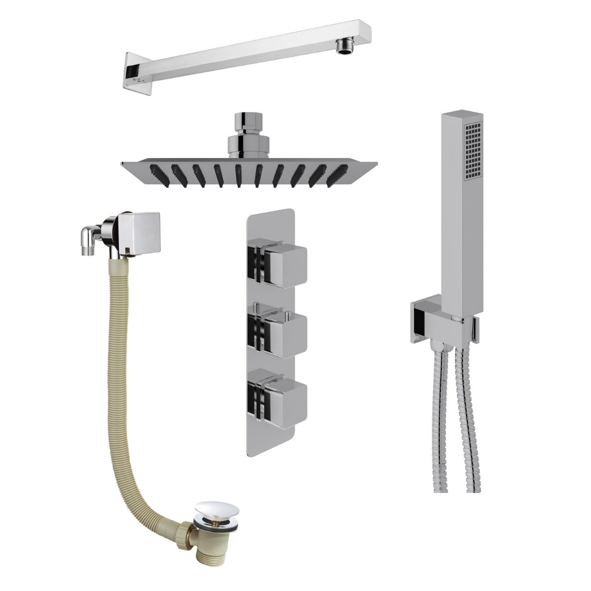 - Contains: Single outlet concealed valve, microphone handset, hose and outlet bracket, 200mm shower head, wall mounted arm, bath overflow filler