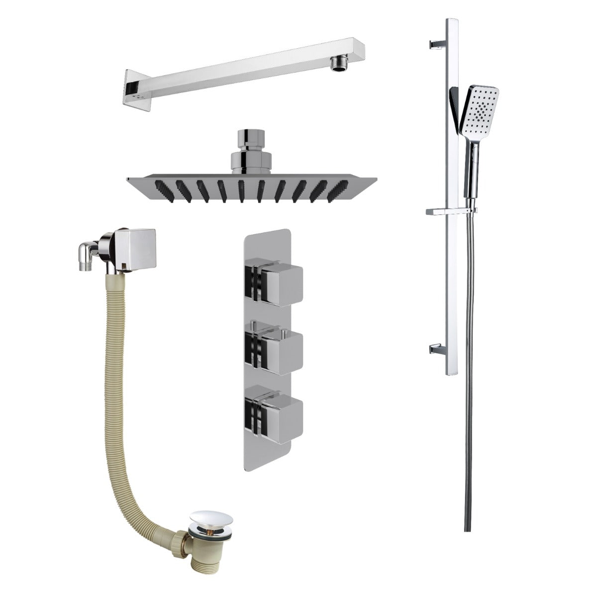 - Contains: Single outlet concealed valve, slide rail kit and elbow, 200mm shower head, wall mounted arm, bath overflow filler