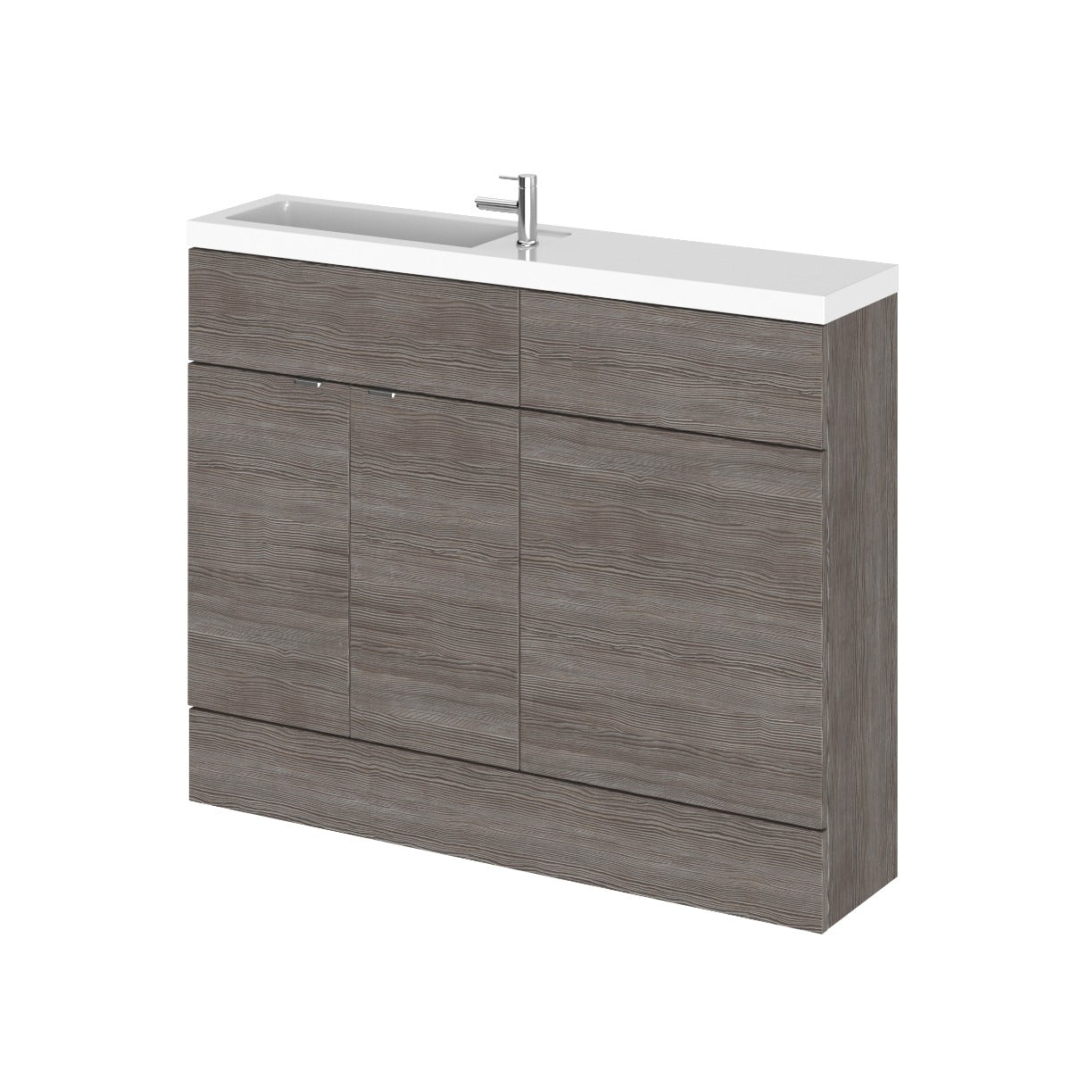 The Fairford Union 1100mm Grey Woodgrain Pack is a well-designed bathroom unit from Stonewater, combining functionality with a sophisticated aesthetic. Its grey avola woodgrain finish adds a timeless appeal, complemented by polished chrome handles and a matching flush button. The unit measures 1100mm wide and includes a 600mm vanity unit, a 500mm WC unit, a single tap hole polymarble basin, and a gloss white worktop, providing a cohesive look and ample storage.